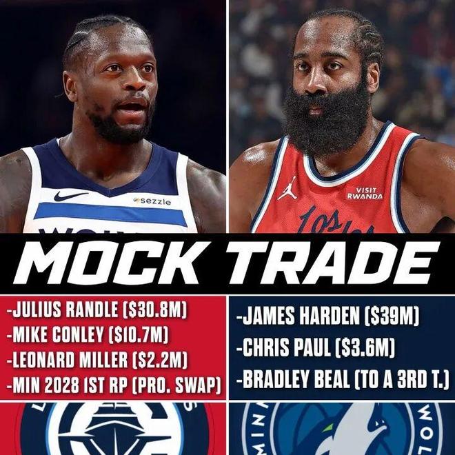 快船送走哈登+保罗+比尔从森林狼换回兰德尔+康利+米勒+28年首轮